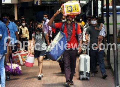 Photo Caption : Migrant workers with their belongings at Bengaluru City Railway station to travel to their native places during Coronavirus lockdown in the wake of the 2nd wave of COVID-19, in Bengaluru on Monday 31st May 2021