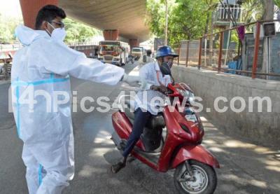 Photo Caption : Health worker stops the motorists and demanding for COVID-19 tests at KR Market, amid surge in coronavirus cases, in Bengaluru on Wednesday 2nd June 2021