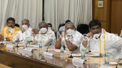 Photo Caption : Ministers Gopalaiah, Byrathi Basavaraju, ST Somashekar, V Somanna and R Ashoka during a meeting on monsoon rain precautionary measures in BBMP range, in Bengaluru on Thursday 3rd June 2021