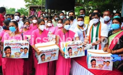 Photo Caption : 5000 ration kits and medical kits distributed to auto, taxi drivers, asha and municipal corporation workers by Congress leader Keshav Rajanna, National youth Congress President BV Srinivas and state youth Congress President Raksha Ramaiah during Coronavirus lockdown in the wake of the 2nd wave of COVID-19, in Bengaluru on Sunday 6th June 2021