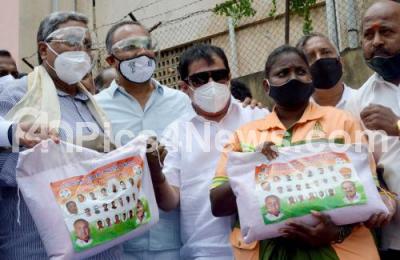 Photo Caption : Congress leaders Siddaramaih and Zameer Ahmed Khan distributed free ration kits to BBMP poura karmika workers during the Coronavirus Pandemic , in Bengaluru on Saturday 12th June 2021 2021