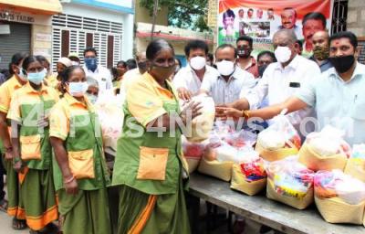 Photo Caption : Former Mayor Sampath Raj and Congress Leaders distributed free ration kits to BBMP poura karmika workers at Cox Town during the Coronavirus Pandemic , in Bengaluru on Saturday 12th June 2021 2021