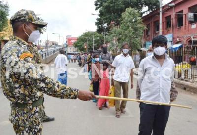 Photo Caption : People stand in queue to collect food distributed by the volunteers at KR Market, as the Coronavirus lockdown was relaxed as part of the Karnataka unlock, in Bengaluru on Monday 14th June 2021