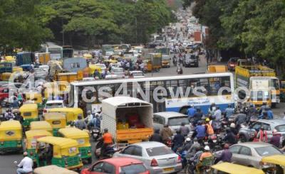 Photo Caption : Vehicles stuck in a traffic jam at JC Road after authorities announced relaxations in COVID-19 lockdown, in Bengaluru on Monday 14th June 2021
