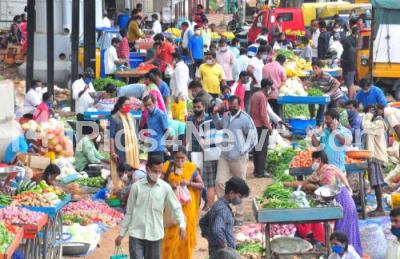 Photo Caption : People shopping vegetables and fruits at a Market on Tumkur Road after authorities announced relaxations in COVID-19 lockdown, in Bengaluru on Monday 14th June 2021