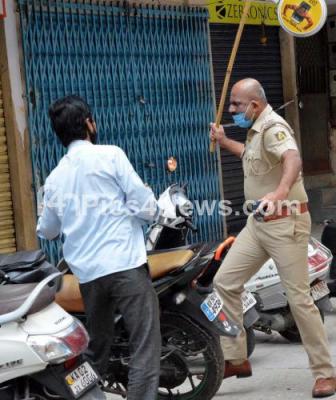 Photo Caption : Police personnel lathi charge the traders, who had kept shops open at SP Road, as non essential commercial shops are not permitted to open as the Coronavirus lockdown was relaxed as part of the Karnataka unlock, in Bengaluru on Wednesday 16th June 2021