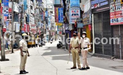 Photo Caption : Police personnel patrolling SP Road, as non essential commercial shops are not permitted to open as the Coronavirus lockdown was relaxed as part of the Karnataka unlock, in Bengaluru on Thursday 17th June 2021