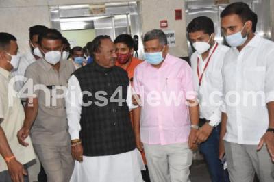 Photo Caption : Ministers KS Eshwarappa and Jagdeesh Shettar seen at BJP Head Office, Malleshwaram, in Bengaluru on Friday 18th June 2021