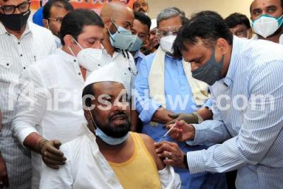Photo Caption : Congress leader Siddaramaiah with MLA Zameer Ahmed Khan inaugurated the vaccination drive for sevadal members during Coronavirus pandemic, in Bengaluru on Saturday 19th June 2021