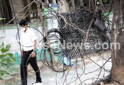 Loose cable and wires left carelessly on footpath and trees, which cause great inconvenience to the commuters, yet unseen by the civic authorities at KR Circle, in Bengaluru on Wednesday 23rd June 2021