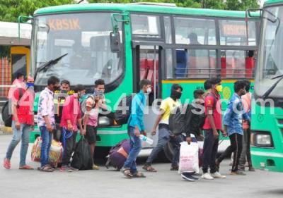 Passengers at BMTC bus stand at Majestic after the Karnataka government eased restrictions for travel amid ongoing Coronavirus lockdown, in Bengaluru on Saturday 26th June 2021