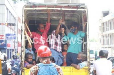 Photo Caption : Daily laborers traveling in the goods carrier vehicle to their workplace after the Karnataka government eased restrictions for travel amid ongoing Coronavirus lockdown, in Bengaluru on Saturday 26th June 2021