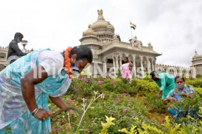 Photo Caption : Workers gardening in the premises of the Vidhana Soudha, in Bengaluru on Saturday 26th June 2021