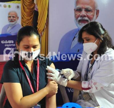 Photo Caption : A health worker administers the covid-19 vaccine to a beneficiary during Coronavirus vaccination drive at Vivekananda College, in Bengaluru on Tuesday 29th June 2021