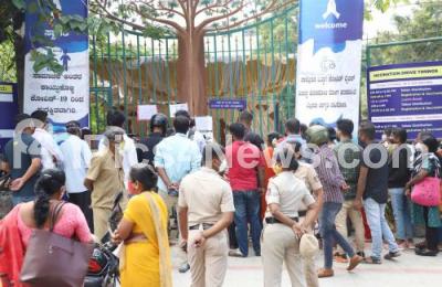 Photo Caption : Police personnel clear the public who jad gathered to enquire about covid-19 vaccination at KC General Hospital after organisation displayed no stock sign boards due to shortage of COVID-19 vaccination, in Bengaluru on Wednesday 30th June 2021