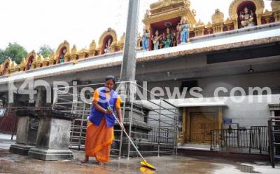 Photo Caption : Banashankari temple staff washing temple premises, after the Karnataka government eased covid-19 restrictions and has allowed to open the religious places with precautionary measures, amid ongoing Coronavirus lockdown, in Bengaluru on Sunday 4th July 2021