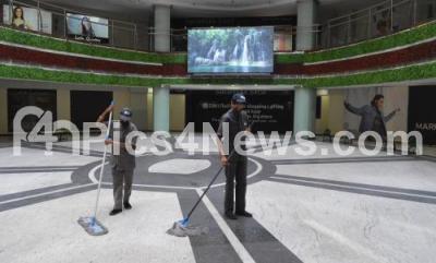 Photo Caption : Garuda mall being cleaned with disinfectants, as the Karnataka government to ease restrictions amid ongoing Coronavirus lockdown, in Bengaluru on Sunday 4th July 2021