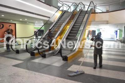 Photo Caption : Garuda mall being cleaned with disinfectants, as the Karnataka government to ease restrictions amid ongoing Coronavirus lockdown, in Bengaluru on Sunday 4th July 2021