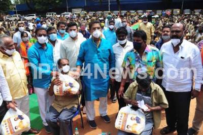 Photo Caption : Minister R Ashok and others distributed ration kits to Auto Rickshaw drivers at Padmanabhanagar amid ongoing Coronavirus pandemic, in Bengaluru on Sunday 4th July 2021