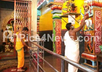 Photo Caption : A priest cleaning the temple premises with disinfectant at Lakshmi Narasimha Temple, Rajaji Nagar, after the Karnataka government eased covid-19 restrictions and has allowed to open the religious places with precautionary measures, amid ongoing Coronavirus lockdown, in Bengaluru on Sunday 4th July 2021