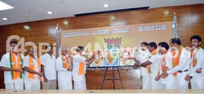 Photo Caption : Puducherry BJP MLAs visit the State BJP office, also seen is Arun Kumar BJP State Organising Secretary, in Bengaluru on Tuesday 6th July 2021