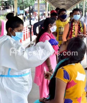 Swab tests to passengers arriving at Bengaluru City Railway Station, after the Karnataka government eased restrictions for travel amid ongoing Coronavirus pandemic, in Bengaluru on Thursday 8th July 2021