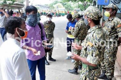 Event Description : BBMP Marshals impose fine on public who were not wearing masks at Majestic Bus stand amid coronavirus pandemic, in Bengaluru on Sunday 11th July 2021