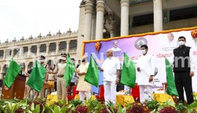 Photo Caption : Chief Minister of Karnataka BS Yediyurappa flagged off to the New Police Department vehicles at Vidhana Soudha, also seen are Home Minister Basavaraj Bommai and others , in Bengaluru on Tuesday 13th July 2021