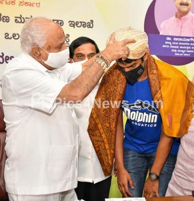 Photo Caption : Chief Minister of Karnataka BS Yediyurappa felicitated and presenting 10 Lakh rupees cheque to Tokyo Olympic participation Swimmer Srihari Nataraj during congratulating program to the Tokyo Olympic participants at Home office Krishna, in Bengaluru on Wednesday 14th July 2021