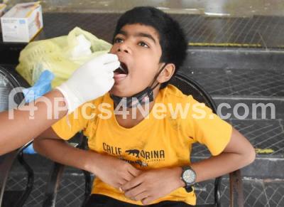 A health worker collects swab samples from a Kid for COVID-19 test at Majestic Bus stand, during COVID-induced lockdown , in Bengaluru on Friday 16th July 2021