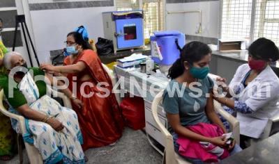 Photo Caption : A health worker administers a dose of the COVID-19 vaccine to a beneficiary at Dasappa Hospital during COVID-19 vaccination drive, in Bengaluru on Saturday 17th July 2021