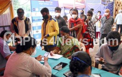 Photo Caption : People wait for their turn to get covid-19 vaccine at Malleshwaram during COVID-19 vaccination drive, in Bangalore on Sunday 18th July 2021