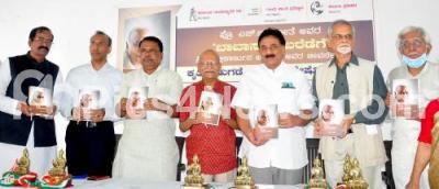 Photo Caption : Nadoja Dr. Woodey P Krishna, President, Karnataka Gandhi Smaraka Nidhi released a book titled "Baba Sahebaredege" at Gandhi Bhavan, also seen are Nadoja Hampa Nagarajaiah, Prof. Mallepuram G Venkatesh, Book Author Prof. HT Pothe and others, in Bengaluru on Wednesday 21st July 2021