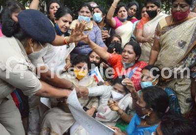 Photo Caption : Police detain the members of Karnataka Congress Mahila Morcha during a protest against Karnataka Minister of Women and Child Development Shashikala Jolle for the alleged Fraud Egg Distribution programme, in Bengaluru on Saturday 24th July 2021