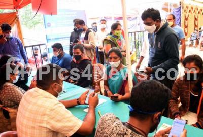 Photo Caption : People wait for their turn to get covid-19 vaccine at Malleshwaram during COVID-19 vaccination drive, in Bengaluru on Saturday 24th July 2021