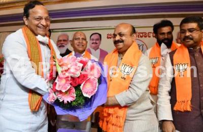 Basavaraj Bommai, newly elected Chief Minister of Karnataka being greeted by former CM BS Yediyurappa, state BJP President Nalin Kumar Kateel, Karnataka in charge Arun Singh, Union Minister Dharmendra Pradhan, Krishna Reddy and others during BJP Legislative Party meeting, in Bengaluru on Tuesday 27th July 2021