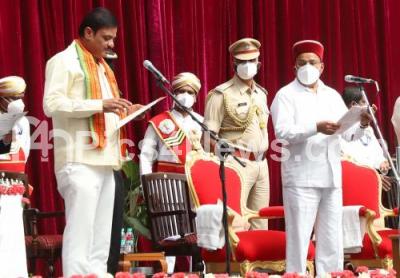 Photo Caption : Governor of Karnataka Thaawar Chand Gehlot administering oath to Munirathna during newly inducted Ministers swearing ceremony at Raj Bhavan, in Bengaluru on Wednesday 4th August 2021