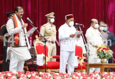 Photo Caption : Governor of Karnataka Thaawar Chand Gehlot administering oath to K C Narayana Gowda (Krishnarajpet, Mandya district) during newly inducted Ministers swearing ceremony at Raj Bhavan, also seen is Chief Minister of Karnataka Basavaraj Bommai, in Bengaluru on Wednesday 4th August 2021