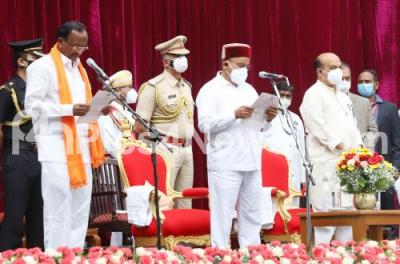 Photo Caption : Governor of Karnataka Thaawar Chand Gehlot administering oath MTB Nagaraj during newly inducted Ministers swearing ceremony at Raj Bhavan, also seen is Chief Minister of Karnataka Basavaraj Bommai, in Bengaluru on Wednesday 4th August 2021