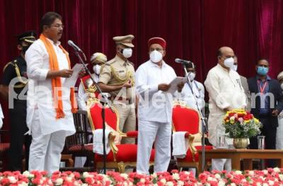 Photo Caption : Governor of Karnataka Thaawar Chand Gehlot administering oath to R Ashok during newly inducted Ministers swearing ceremony at Raj Bhavan, also seen is Chief Minister of Karnataka Basavaraj Bommai, in Bengaluru on Wednesday 4th August 2021