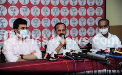 Photo Caption : Karnataka BJP MPs DV Sadananda Gowda, PC Mohan and Tesjasvi Surya addressing a press conference, in Bengaluru on Saturday 7th August 2021