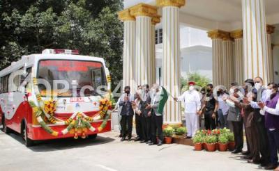Photo Caption : Governor of Karnataka Thaawar Chand Gehlot flagged off the Blood collection transportation bus at Raj Bhavan, in Bengaluru on Saturday 7th August 2021