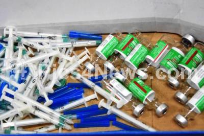 Photo Caption : COVID-19 vaccination injected syringes at Malleshwaram Vaccine centre, during COVID-19 vaccination drive, in Bengaluru on Sunday 8th August 2021