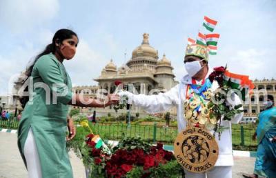 A man distributing roses and Indian tricolor flags to fellow Indians in front of Vidhan Soudha on 75th India Independence Day celebrations, in Bengaluru on Sunday 15th August 2021