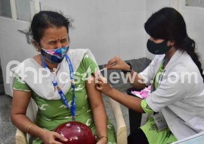 Photo Caption : A health worker administers a dose of the COVID-19 vaccine to a beneficiary at Dasappa Hospital, during COVID-19 vaccination drive, in Bengaluru on Monday 16th August 2021