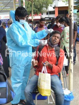 Swab tests to passengers arriving at the Bengaluru City Railway Station, after the Karnataka government eased restrictions for travel amid ongoing Coronavirus pandemic, in Bengaluru on Wednesday 18th August 2021