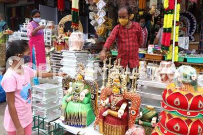 Photo Caption : People buying pooja items at Malleshwaram ahead of Varamahalakshmi festival, in Bengaluru on Wednesday 18th August 2021