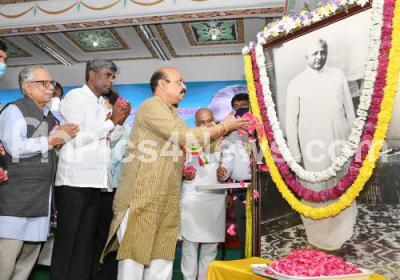 Photo Caption : CM Basavaraj Bommai with Minister Kota Srinivas Poojary offering floral tribute to the Former CM Devaraj Urs portrait on the occasion his birth anniversary programme at Banquet Hall, Vidhana Soudha, in Bengaluru on Friday 20th August 2021