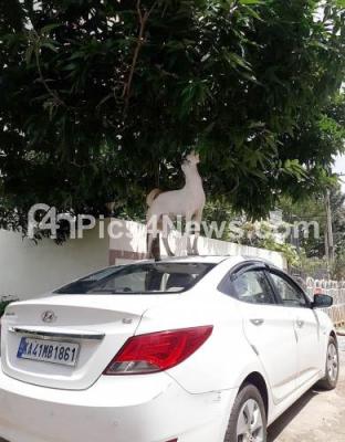 Photo Caption : A goat eat the greens leaves by climbing a car at Visveshwaraiah layout, in Bengaluru on Sunday 22nd August 2021