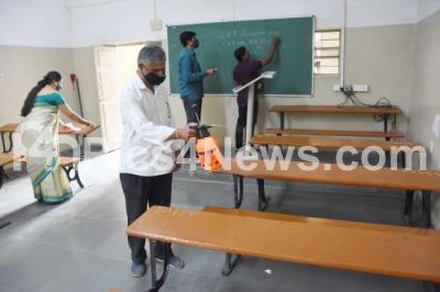 Photo Caption : School teachers and staff writing exam registration numbers on the desk at Seshadripuram College ahead of CET exam, in Bengaluru on Friday 27th August 2021